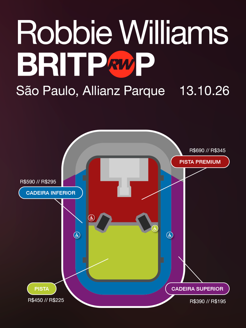 Começa nesta quinta-feira, dia 09/04, a partir do meio-dia, a venda de ingressos para o único show de Robbie Williams no Brasil. O artista apresenta sua turnê BRITPOP no dia 13 de outubro em São Paulo, no Allianz Parque. Essa turnê teve início em maio de 2025 em Edimburgo, na Escócia, e já passou por 24 países, chegando à marca de 1,2 milhão de público. Esse ano estão confirmados shows na Europa, África, América Central, América do Sul e Oceania. O fechamento será em novembro, na Nova Zelândia.